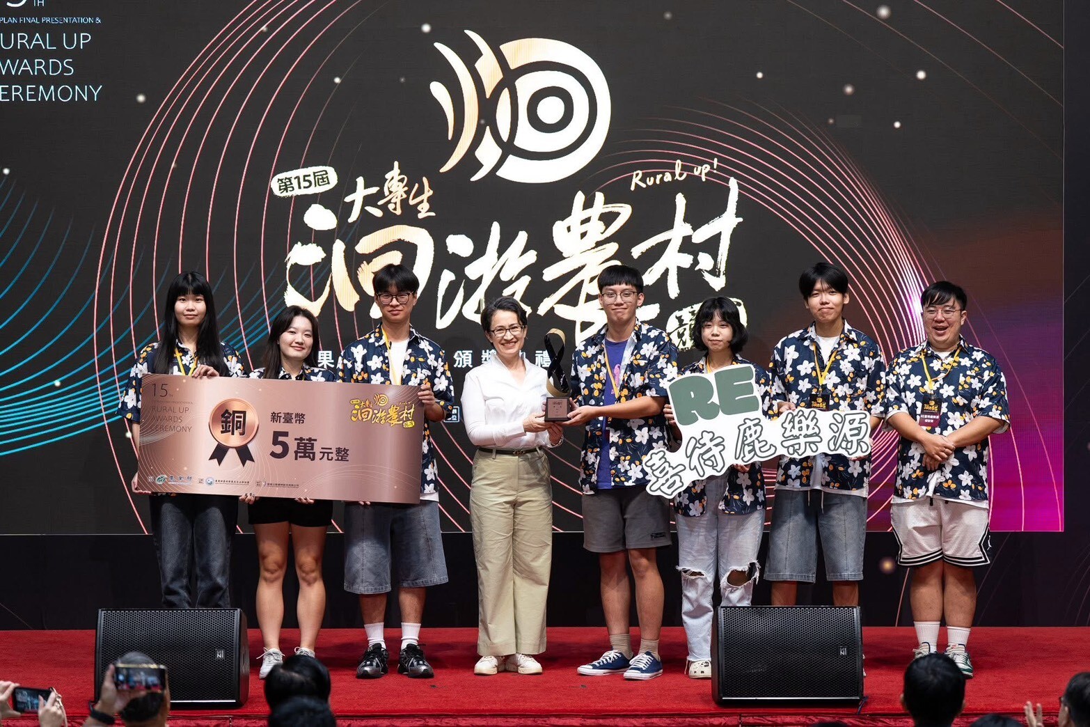 農業部主辦的「第十五屆大專生洄游農村競賽」成果發表會暨頒獎典禮於114年9月14日在臺北合庫銀行國際會議中心盛大舉行,來自文化資源與休閒產業學系的「RE喜待鹿樂源」團隊,在全國20支團隊、152位學生激烈競爭中脫穎而出,一舉榮獲「銅獎」殊榮並抱回「好事花生獎」、「洄游新星獎」及「樸石化玉」等多項特別獎,為本校在地實踐教育再添佳績。