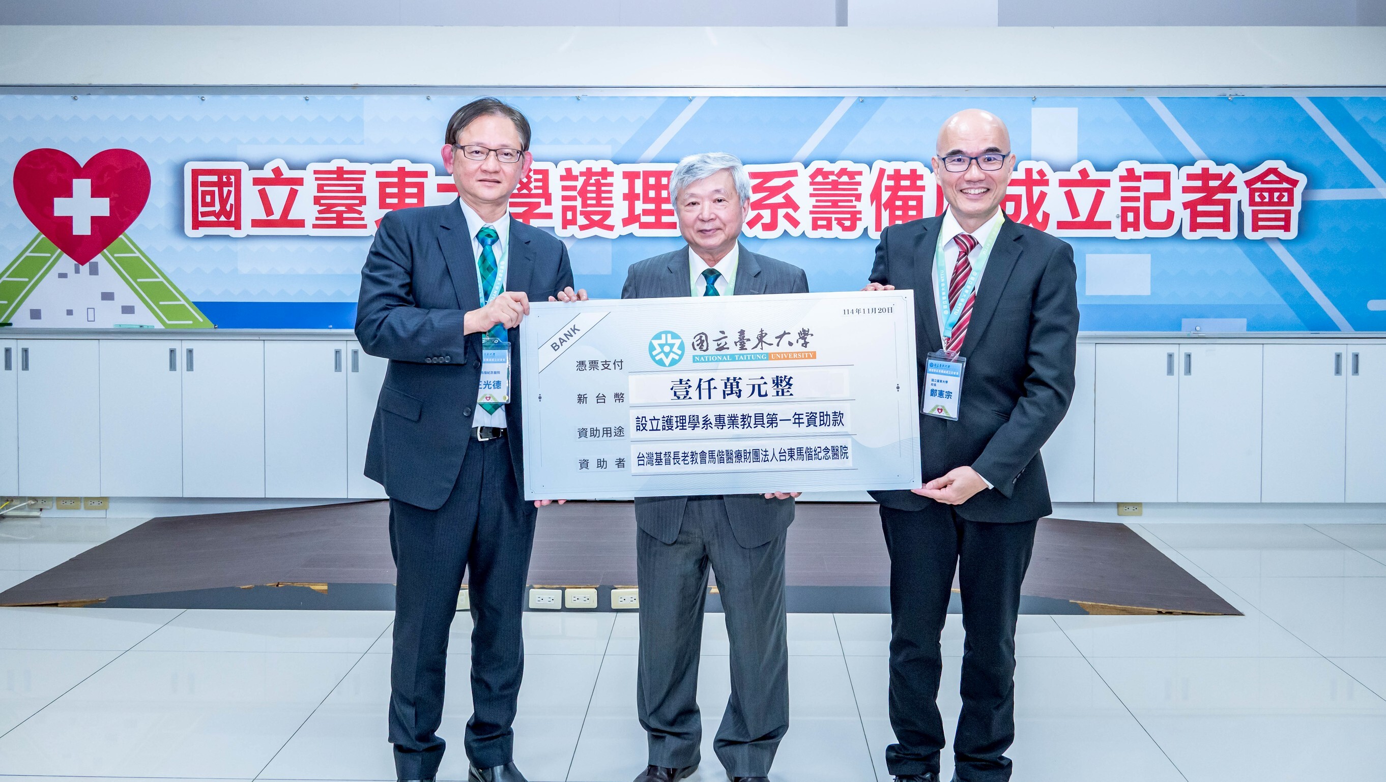 記者會由鄭憲宗校長率領一級主管出席,在立法委員陳瑩、中央研究院院士梁賡義、縣議會議長吳秀華,臺東縣政府盧協昌秘書長、台灣基督長老教會馬偕醫療財團法人蕭聰穎董事長、馬偕紀念醫院總院陳治平副總院長、台東馬偕紀念醫院王光德院長、臺東縣醫師公會何活發理事長、醫療財團法人南迴基金會李靜蘭董事長等產官學界代表的共同見證下,隆重為護理學系揭牌。蕭聰穎董事長今日更履行合作備忘錄的約定,資助護理學系第一年的設備費一千萬整,象徵雙方攜手為臺東培育醫護人才的重要里程碑。