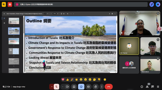 (圖說)吐瓦魯駐臺大使法莉莉大使於線上培訓課程進行分享