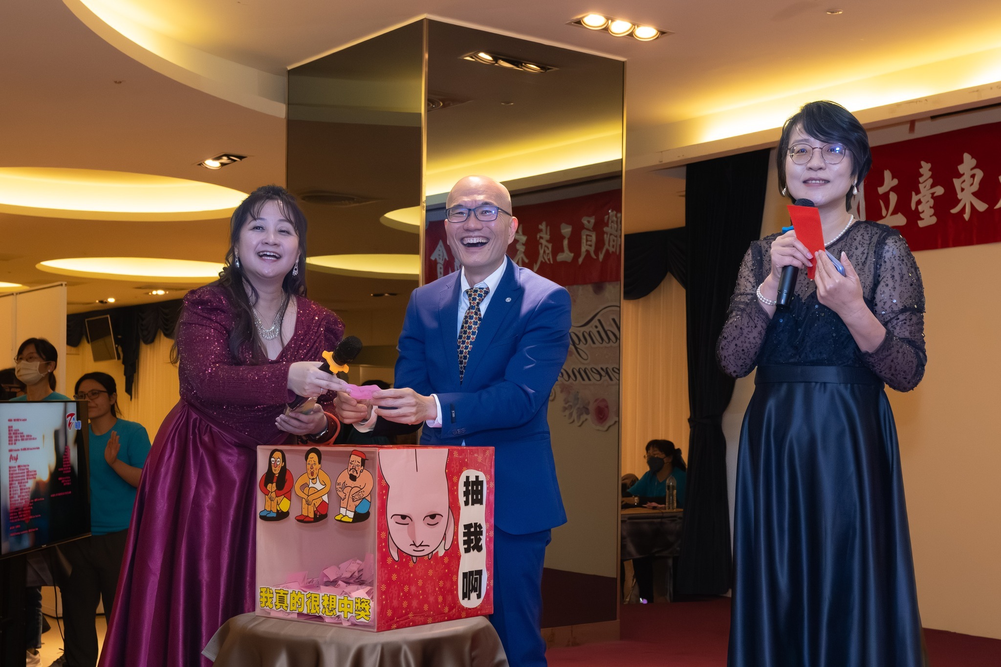 本次活動由人事室精心規劃,內容結合校長致詞、摸彩活動與多組精彩演出,現場氣氛熱絡融洽。學校及一級主管共提供了近百份獎品,中獎率約為五分之一,近五百位教職員工同仁滿懷期待,等待幸運之神降臨。抽獎箱上貼著「我真的很想中獎」標語,更直率地表達出同仁們的心聲。摸彩過程中,眾人屏息以待的緊張時刻,與揭曉中獎時的歡呼尖叫交織,現場笑聲此起彼落,為歲末聯歡增添滿滿歡樂氣息。