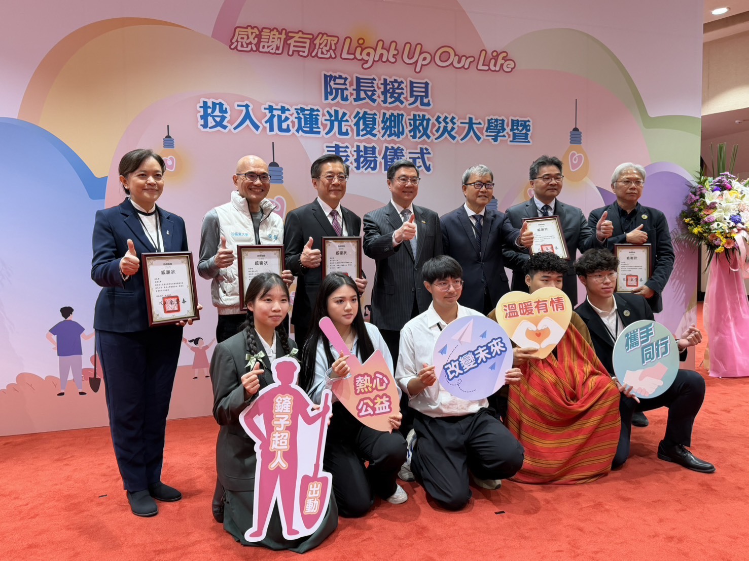 活動最後,行政院頒發感謝狀予各校代表,感謝大學師生於災後期間的實際付出。本校未來將於115學年度下學期持續推動「光復.復光」社會實踐計畫,由教師帶隊,陪伴學生再次走入社區,協助災後重建,深化大學社會責任之實踐。