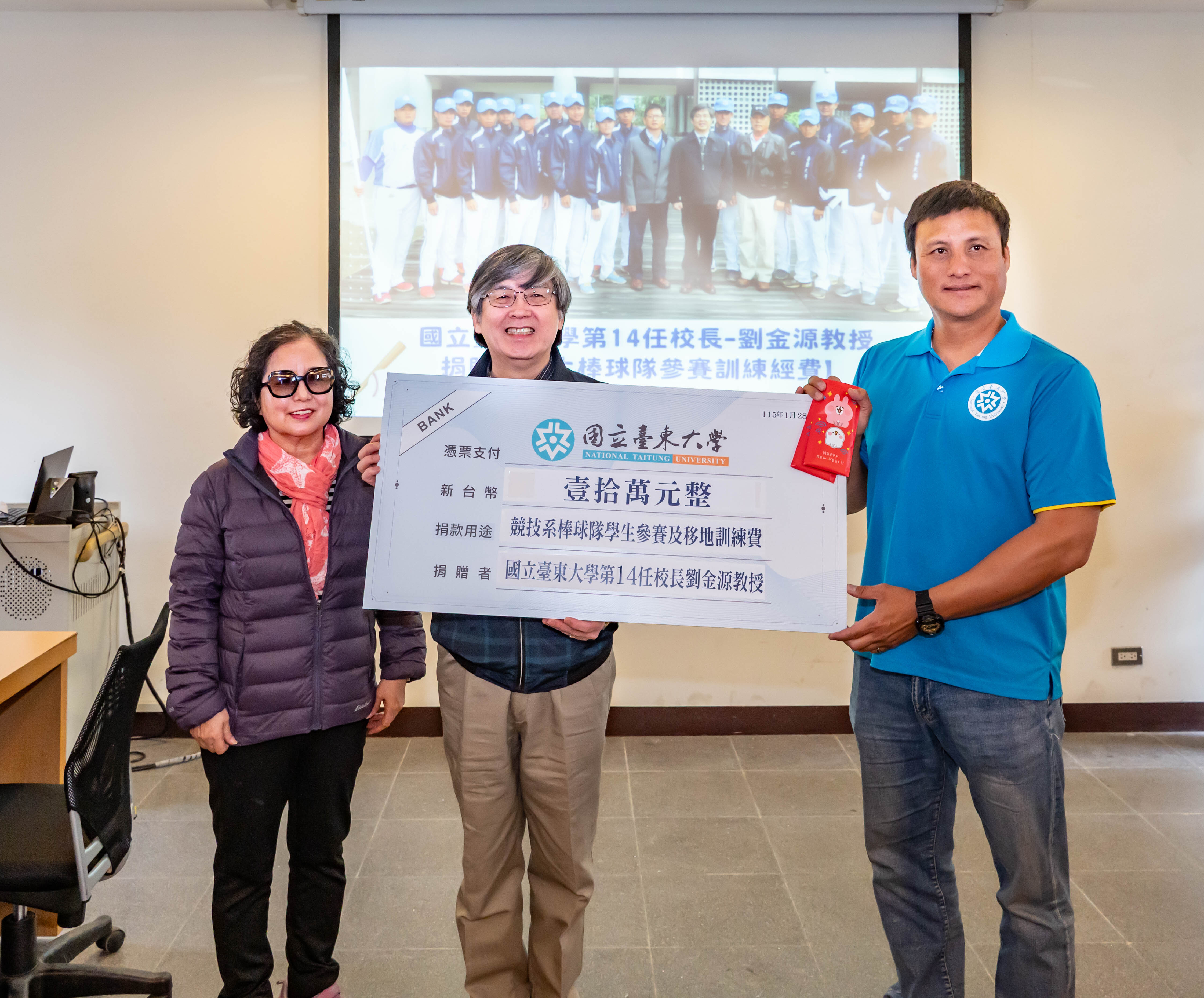 圖說:劉金源前校長(中)捐贈10萬元支持東大棒球隊發展。