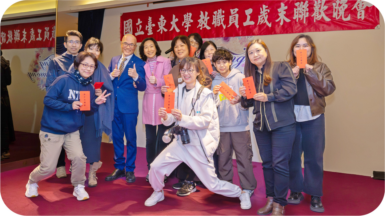 本校於115年1月7日晚間,假娜路彎大酒店舉辦「114年教職員工歲末聯歡餐敘晚會」,邀集全校教職員工及退休同仁齊聚一堂,以歡聚熱鬧的氛圍共迎新年,感謝彼此一年來在教學、研究、行政與服務的付出與努力。詳全文