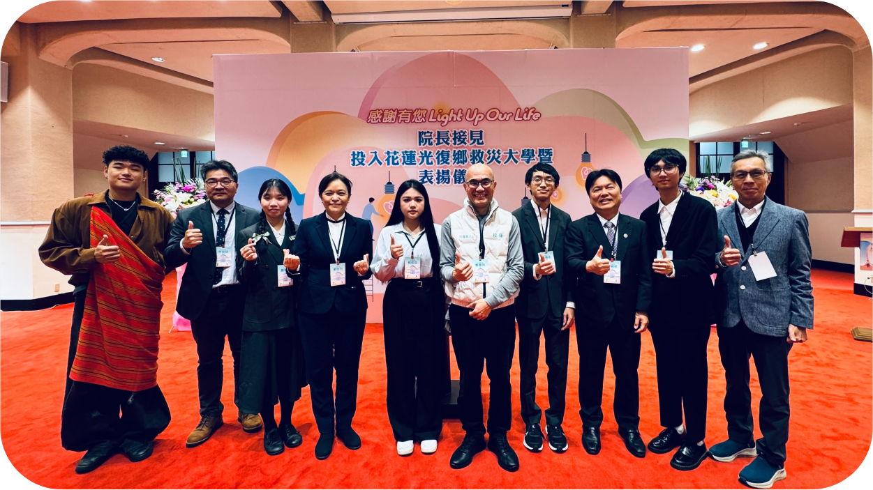 為表彰大專校院師生投入花蓮縣光復鄉災後救援與重建行動,行政院於115年1月26日下午在行政院大禮堂舉辦「院長接見投入花蓮光復鄉救災大學暨表揚儀式」,頒發感謝狀予各校志工代表,肯定大學師生於災後第一時間投入行動、協助地方復原的具體貢獻。詳全文