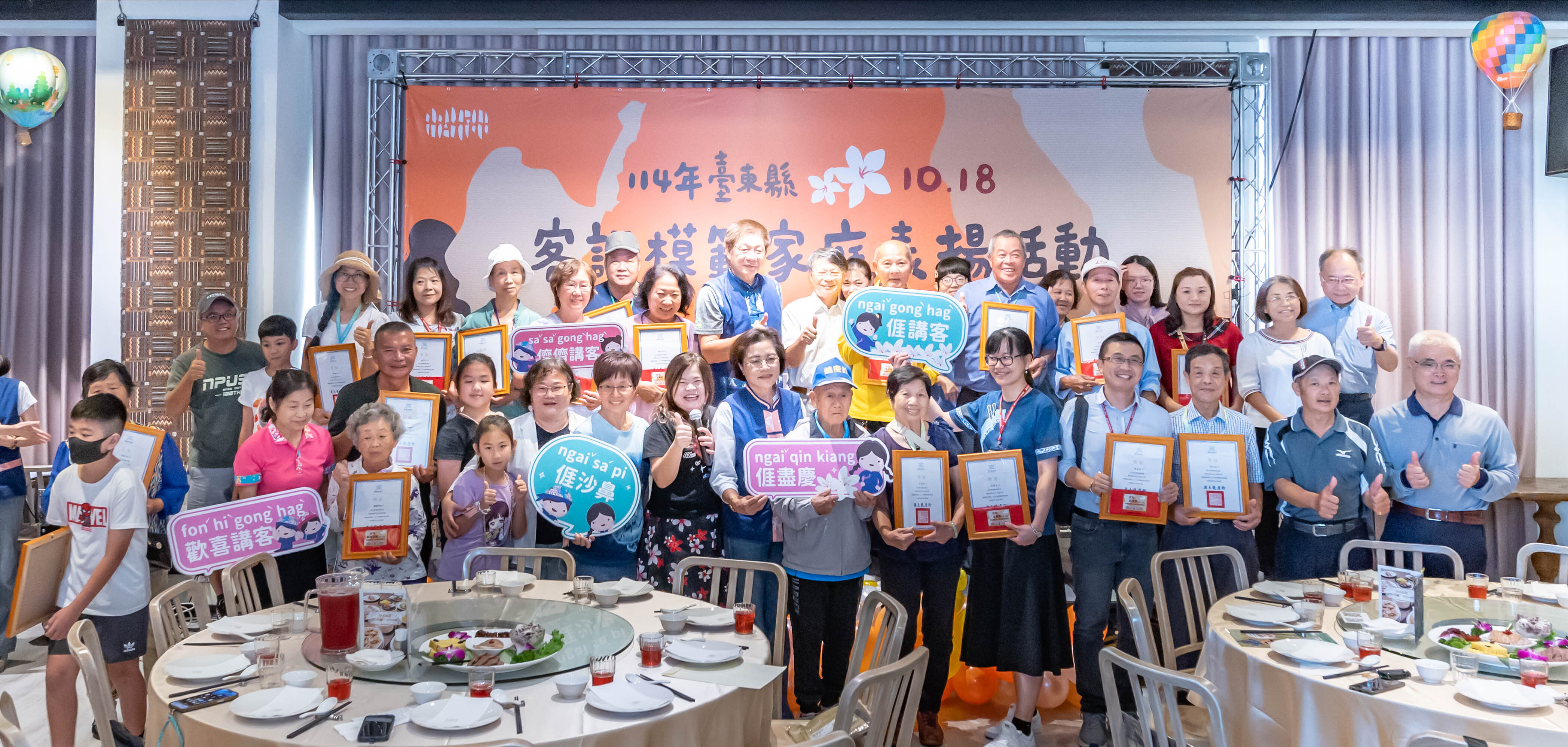 為推廣母語家庭化、生活化,臺東縣政府於114年10月18日上午11時假GAYA潮飯店十樓隆重舉辦「臺東縣114年客語模範家庭表揚活動」。活動由客家委員會指導、臺東縣政府主辦、華語文學系執行,透過公開表揚推崇模範家庭,肯定客語家庭在文化傳承的努力與貢獻。