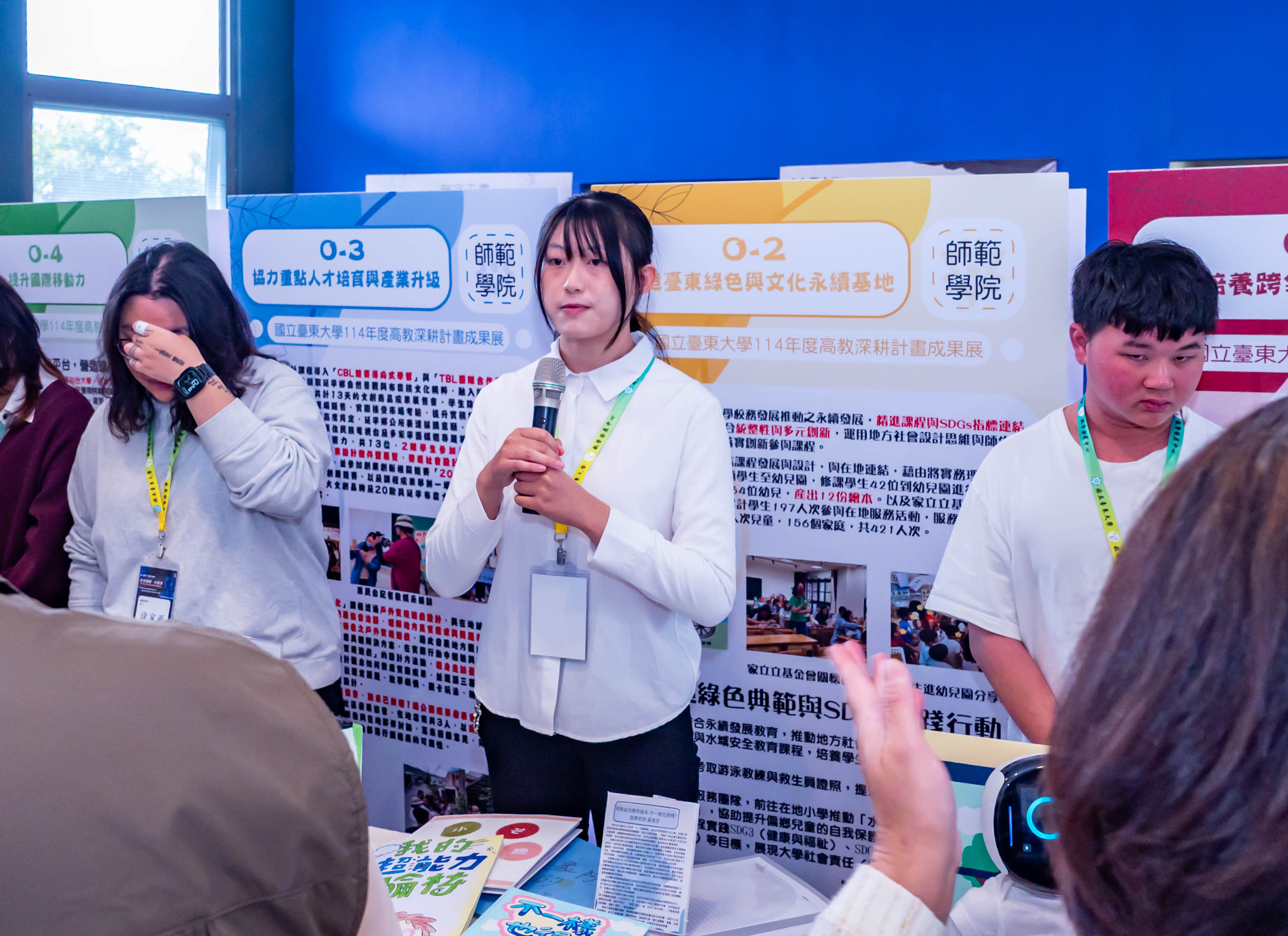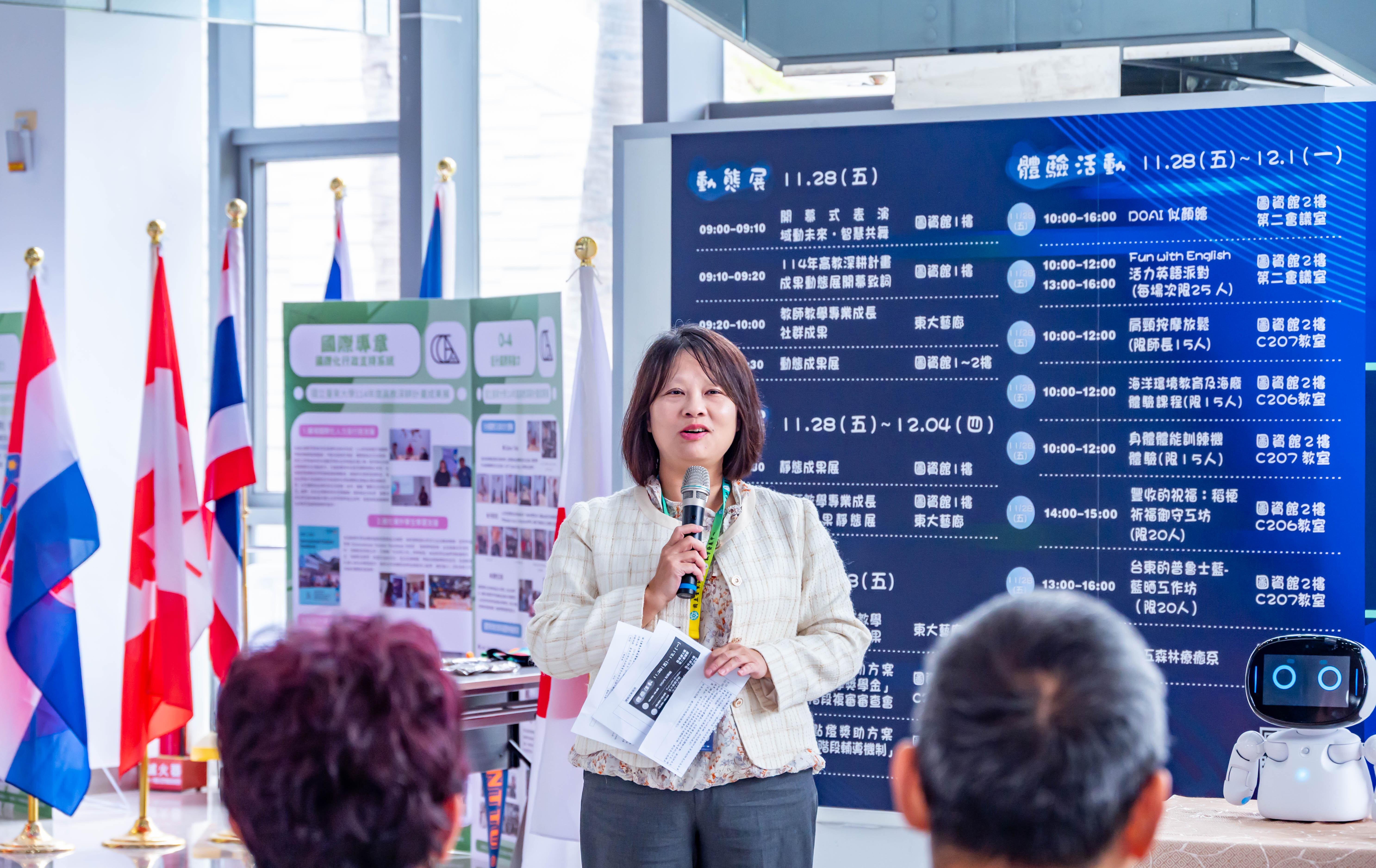 本校114年高等教育深耕計畫成果展於114年11月28日早上9點在圖書資訊館資訊棟1樓盛大開幕,展出時間至12月4日。今年以「跨域融通.AI啟航」為主題,透過成果發表、動靜態展覽與多項體驗課程,全面呈現本校在AI技術導入、多元跨域課程、在地文化連結、科學教育與國際學習等多方位的教學成果,展現臺東大學持續推動創新教學的強勁能量。