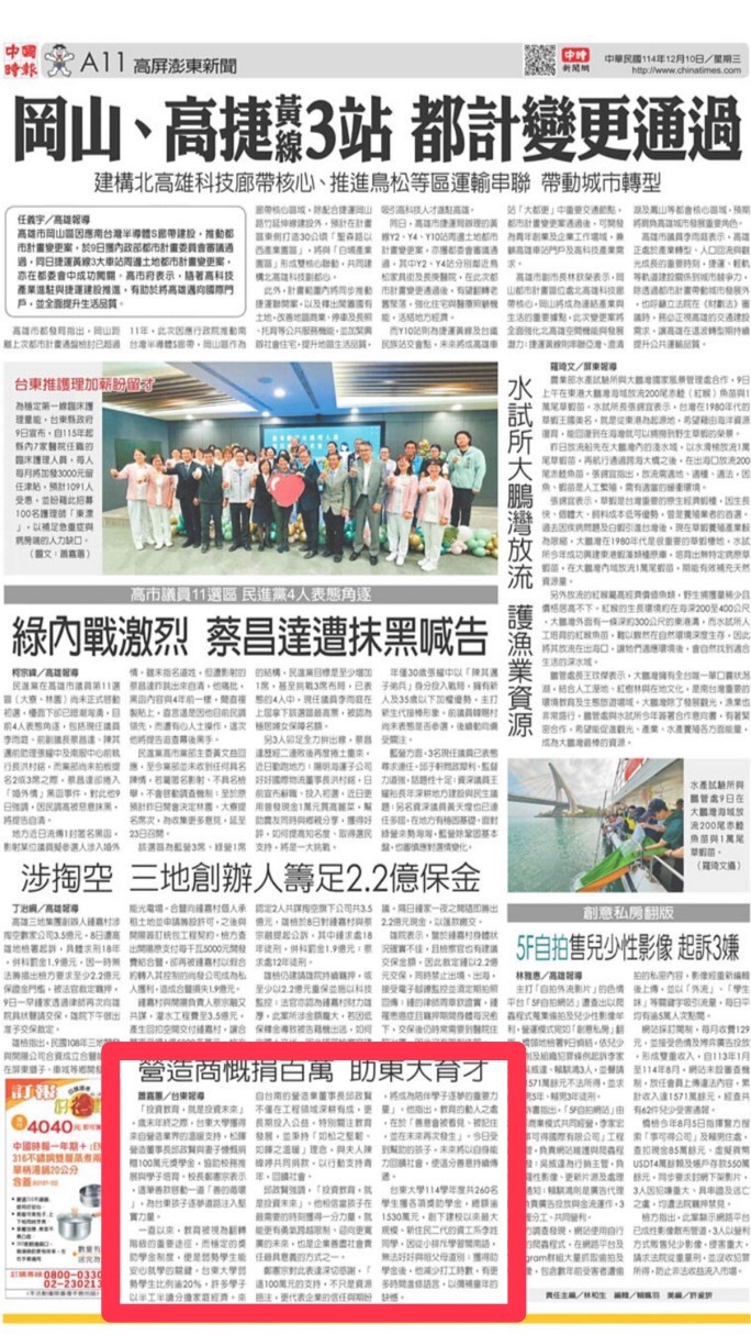 報導來源:松暉營造暖心助學 捐款百萬力挺臺東大學(20251208 經濟日報)