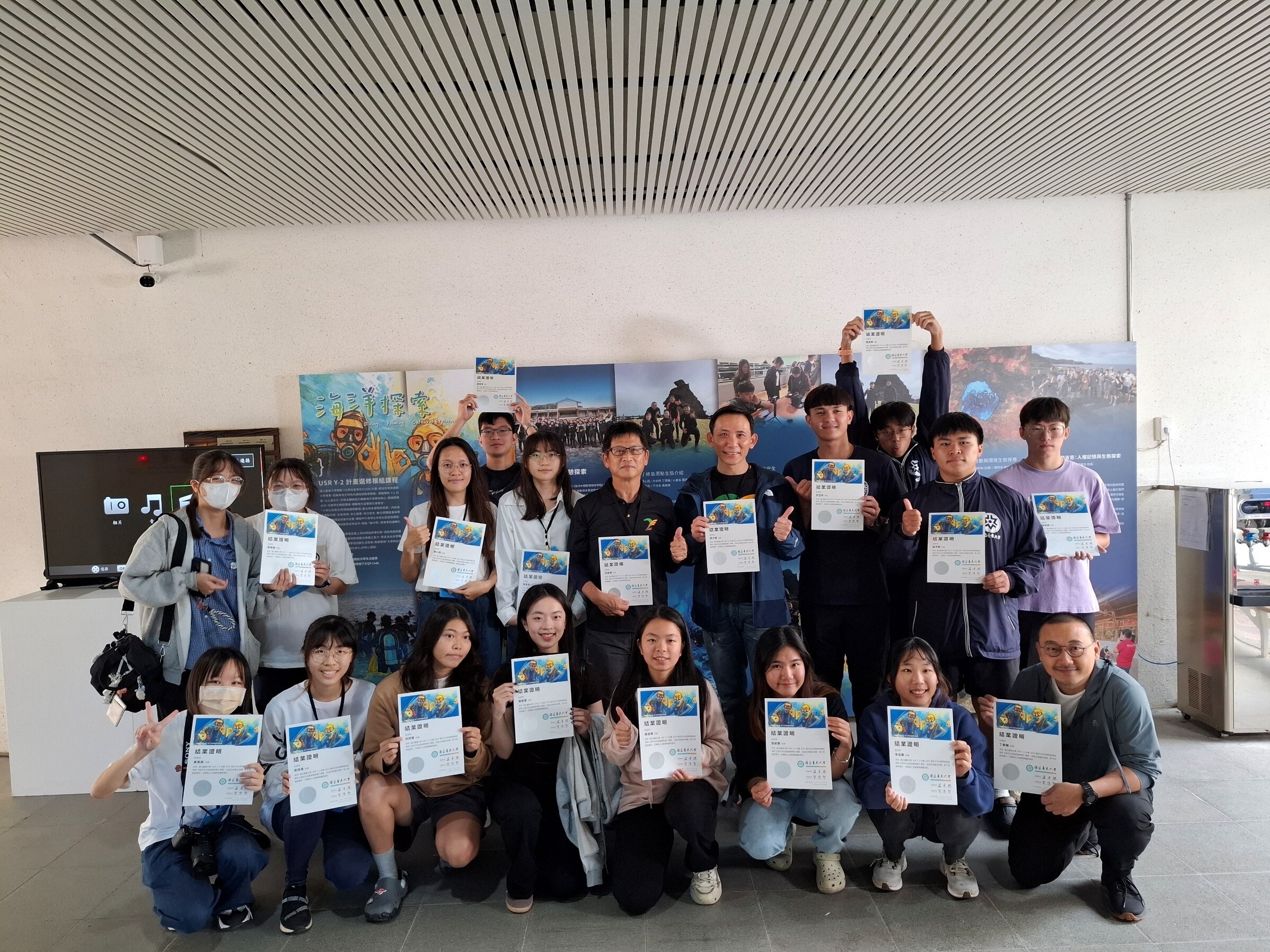 (圖說) USR成果展-跨域模組課程《海洋文化與遊憩探索》在成果展板前頒發結業證書