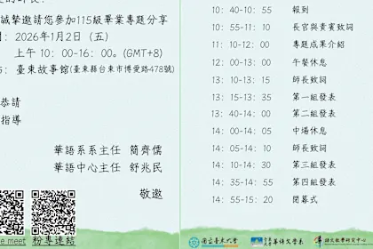 國立臺東大學華語文學系將於115年1月2日早上,在臺東故事館舉辦「114學年度華語教學專題全球成果發表會——東籬耕華,悠見文心」,並同步透過 Google Meet與 YouTube進行線上直播,邀請國內外華語教學學者與教師共同參與,呈現文學創作與教學實踐交會而生的多元成果。