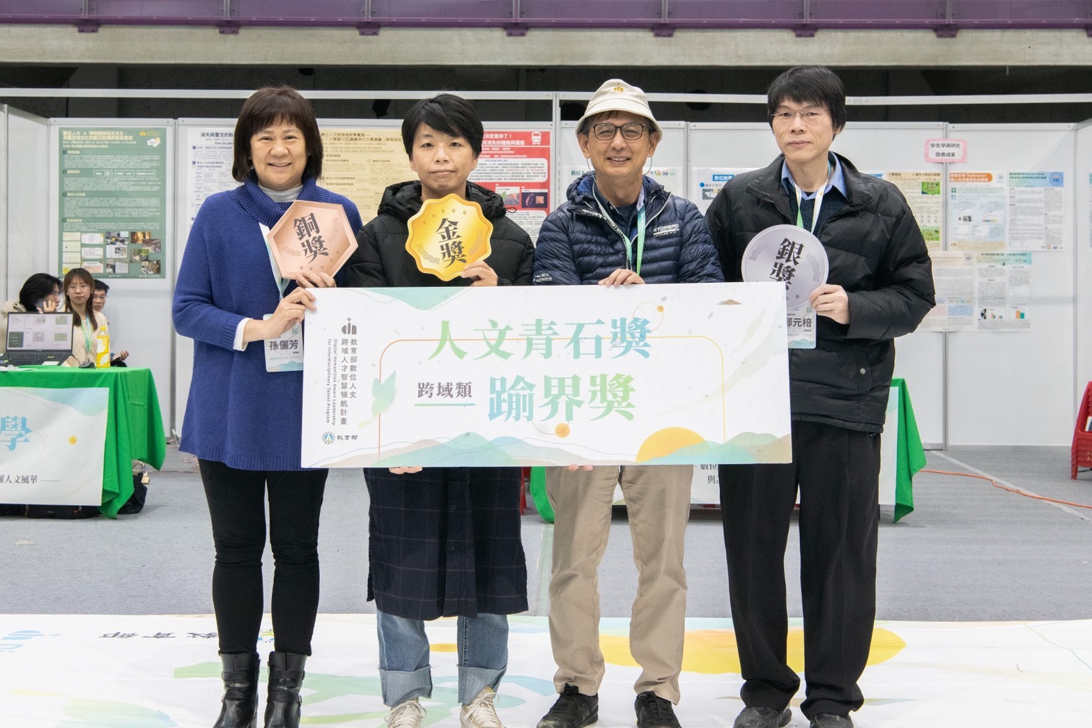 圖說:榮獲「跨域類-踰界獎」的是由鄭元棓(右一)、卓淑敏老師授課之「數位人文遊戲企劃課程」