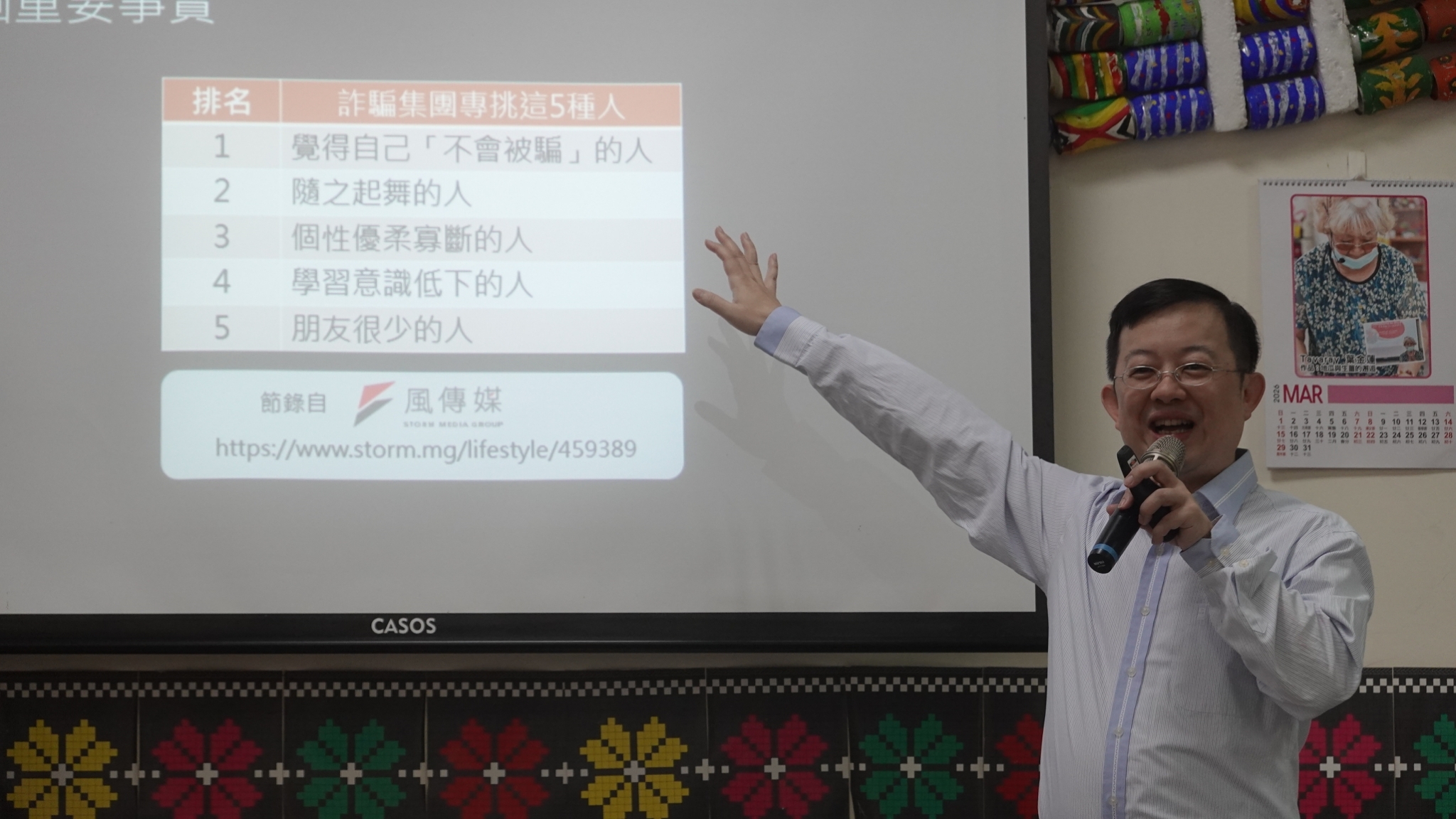 為提升高齡長者對詐騙手法的辨識能力,人文創新與社會實踐中心於115年3月24日於撒舒而雅部落文化健康站舉辦首場「AI防詐宣導」活動,以《詐騙情境秀:一起來破解》為主題,結合人工智慧技術與在地經驗,打造貼近生活的防詐學習場域。