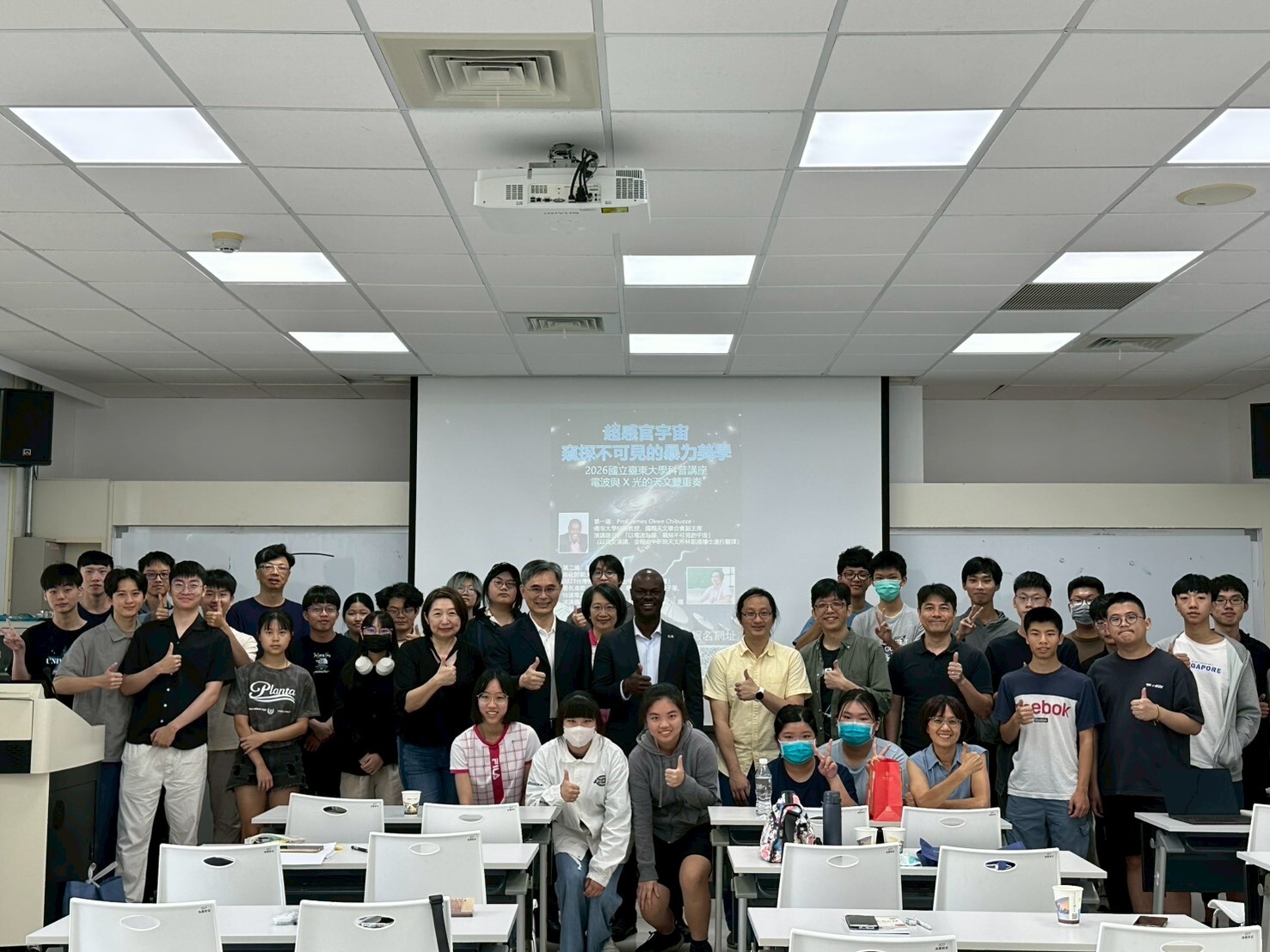 本次講座陣容堅強,首場由國際天文聯合會(IAU)副主席James Okwe Chibueze教授主講「撥開星際雲霧:電波望遠鏡下的宇宙真相(Piercing the Cosmic Dust:Unveiling the Universe Through Radio Waves)」。Chibueze教授帶領現場聽眾從宇宙發光物理機制開始,認識無線電波使可見光望遠鏡下難以窺見的星際介質「無所遁形」,使之對宇宙的認識更加全面。作為南非MeerKat電波望遠鏡陣列的重要領航者,Chibueze教授此次來訪不但介紹世界知名望遠鏡計劃,亦奠下未來與東大及台灣天文研究合作的契機。