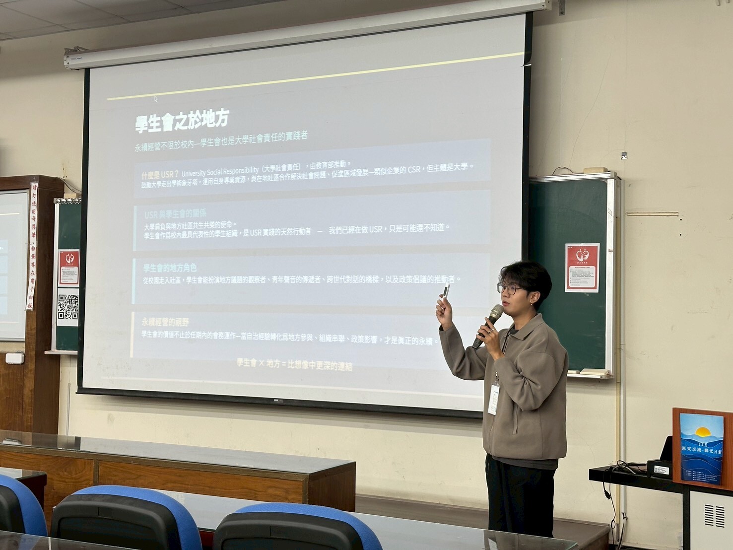 學生會自114年榮獲教育部「卓越獎」後,便積極推動跨域合作交流。活動特別邀請本校學生會第17屆會長郭武嚳擔任講師,分享「學生會與地方政府」的實踐之路。郭武嚳指出,學生會不只是校內的行政組織,更是連結社會、回應議題的實踐平臺,透過與地方政府的共榮共好,主動發揮青年專業、表達學生需求,能有效提升組織的政策影響力與社會能見度。